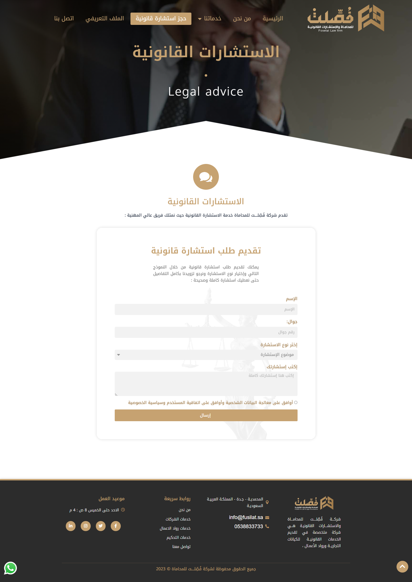 - اضافة خاصية برمجية وهي تقديم طلب الحصول على استشارة قانونية من خلال ملىء النموذج وبعد الضغط ارسال سوف يصل الى الشركة بريد الكتروني بمحتوى الاستشارة ويمكنهم الرد على الطلب المقدم.